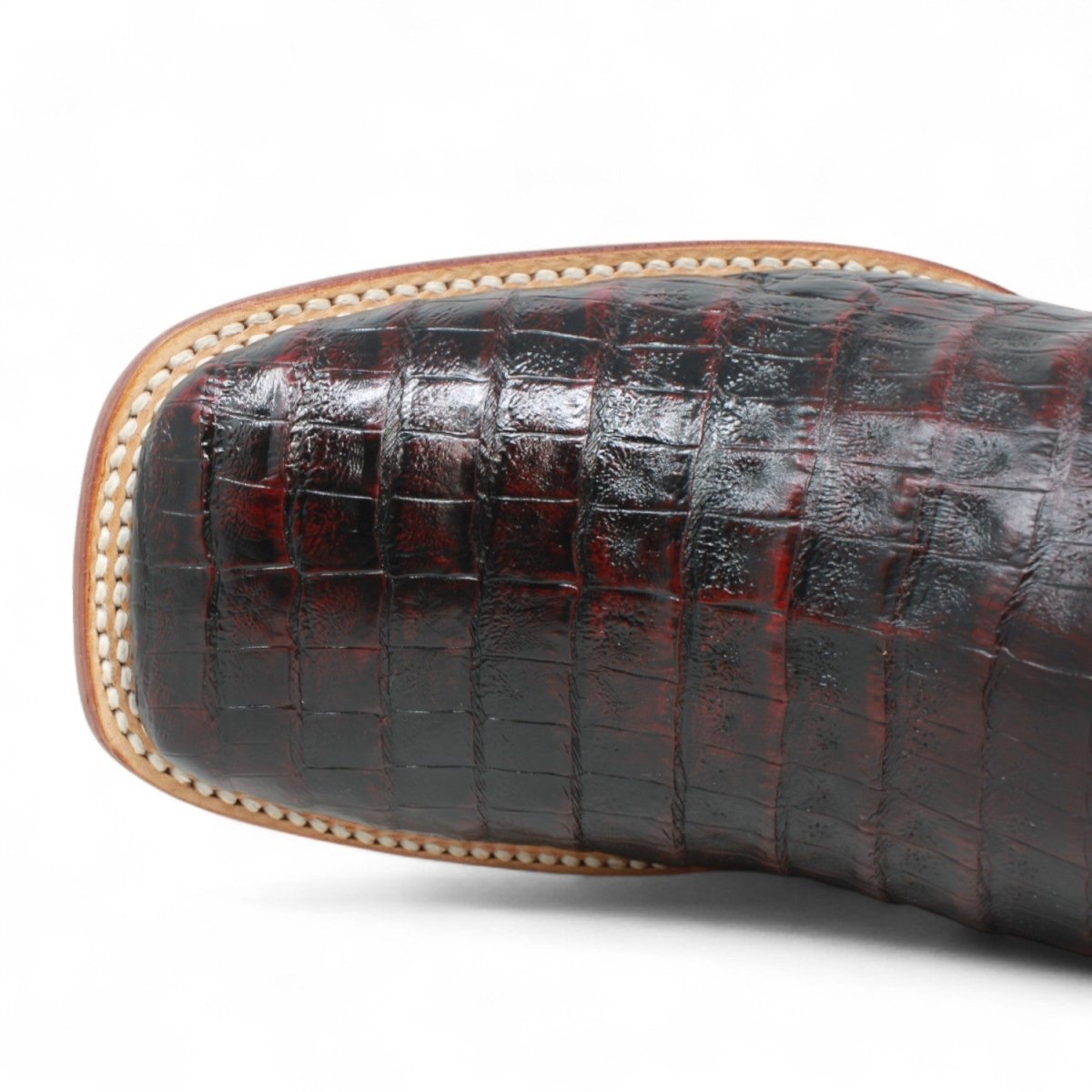 Botas de Panza de Caiman Original Punta Rodeo Cuadrada Ancha Color Negro Rojizo
