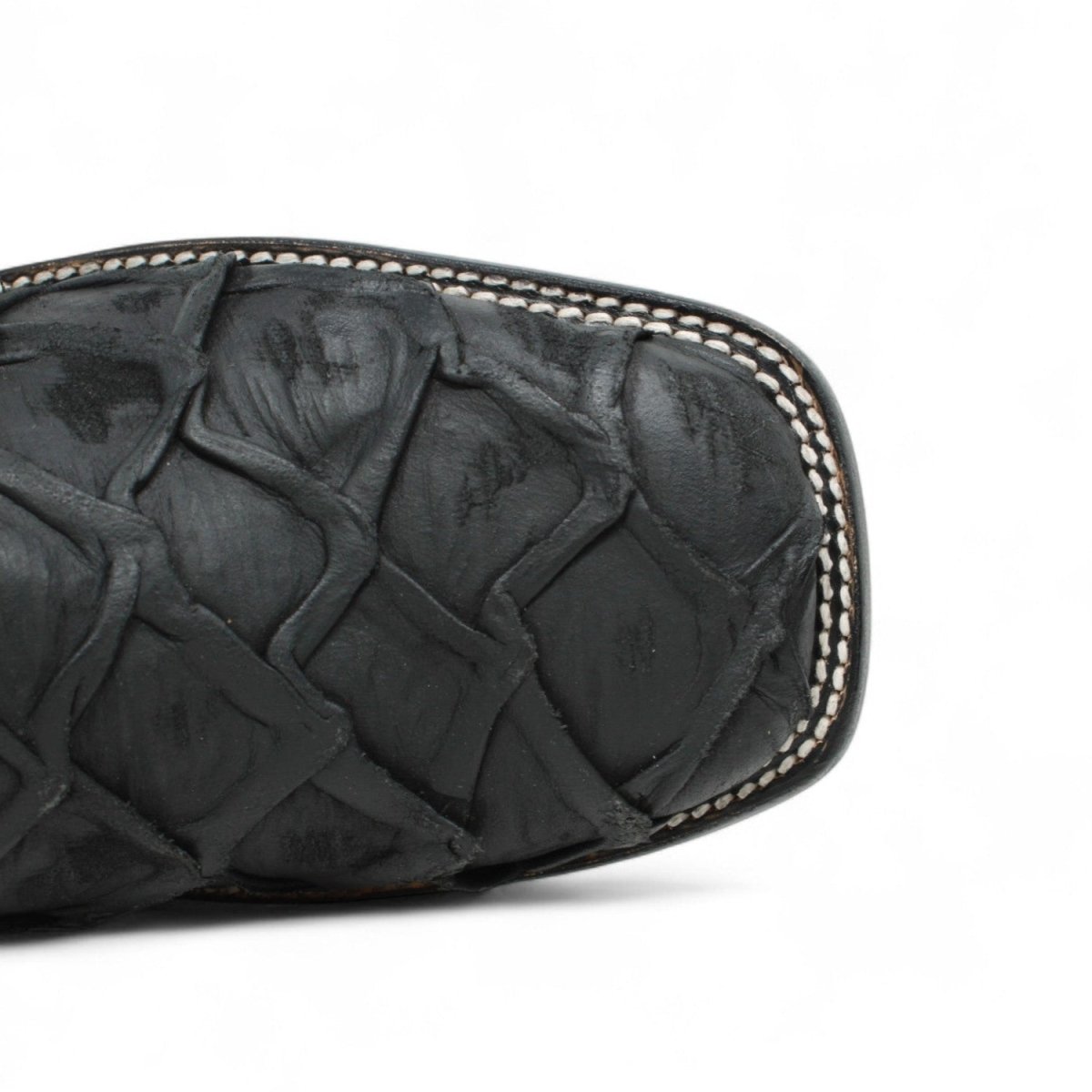 Botines de Piel Grabado Pez Pirarucu Punta Cuadrada Color Negro- Hooch Boots